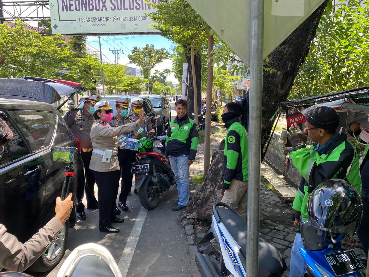 Wadir Lantas Polda Sulsel Pimpin Anggota Bagikan Makanan ke Pengemudi Ojol dan Tukang Becak