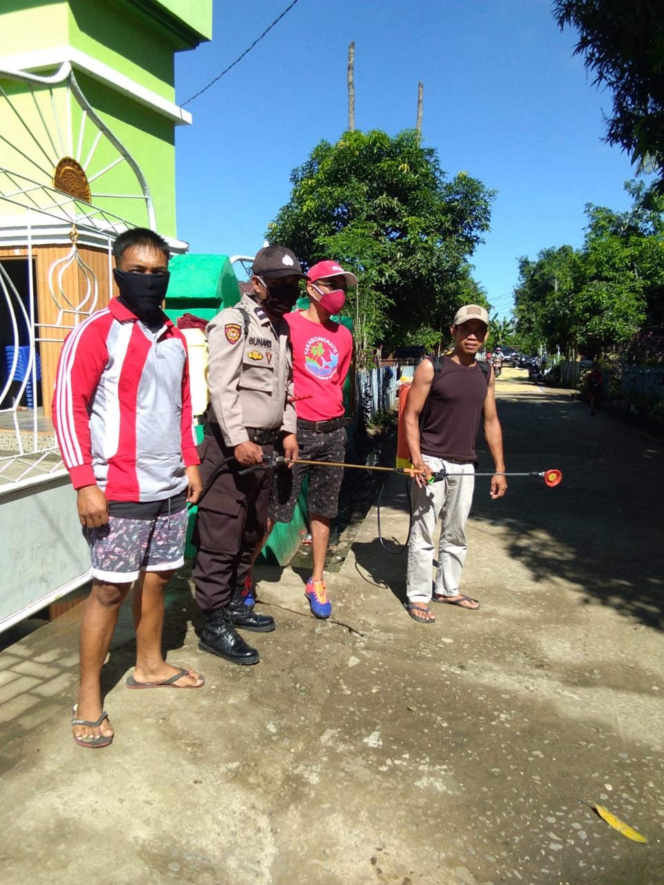 Bhabinkamtibmas Desa Lengkese Bersinergi Dengan Warga Melakukan Penyemprotan Cairan Disinfektan Ke Pemukiman Warga