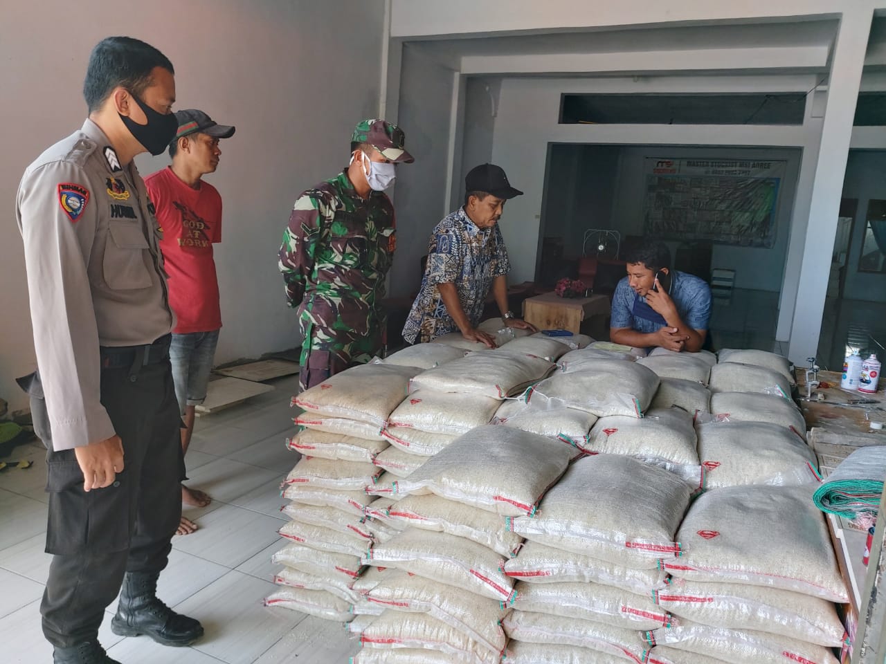 SULSELBERITA.COM. TAKALAR – Bhabinkamtibmas Desa Bontokadopepe, bersam Babinsa melakukan Pemantauan Bahan Pokok yang baru tiba dikantor Badan Usaha Milik Desa ( Bumdes) Desa Bontokadopepe untuk dibagikan kepada warga Desa Bontokadopepe, Kecamatan Galesong utara, Kabupaten Takalar. Selasa, (14/4/2020).