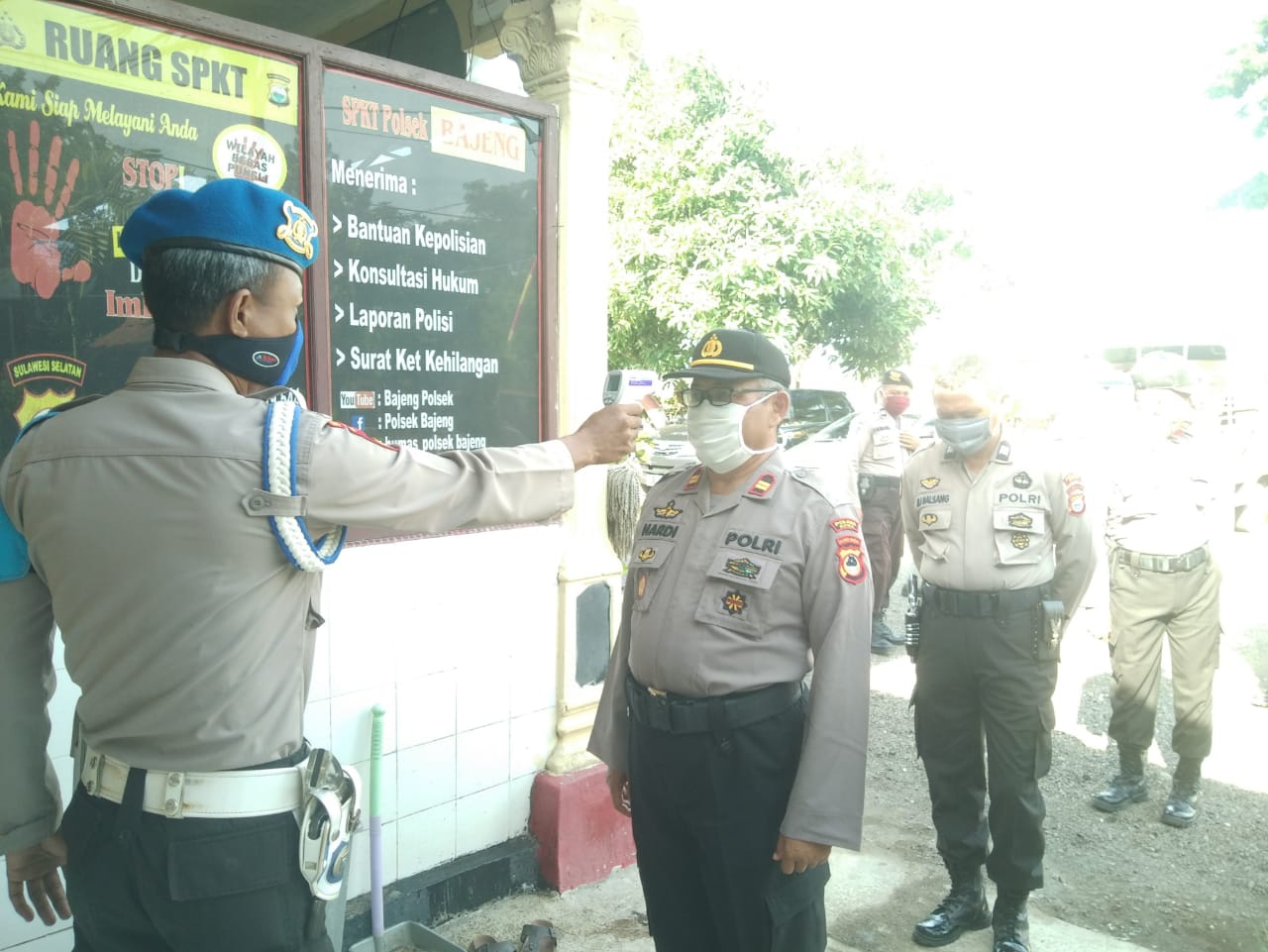 Kegiatan pemeriksaan kondisi suhu tubuh dengan menggunakan termometer tembak dipimpin Kapolsek Bajeng Iptu Sunardi, SH, MH didampingi Wakapolsek Bajeng Iptu Hapid, diikuti seluruh personil Polsek Bajeng.
