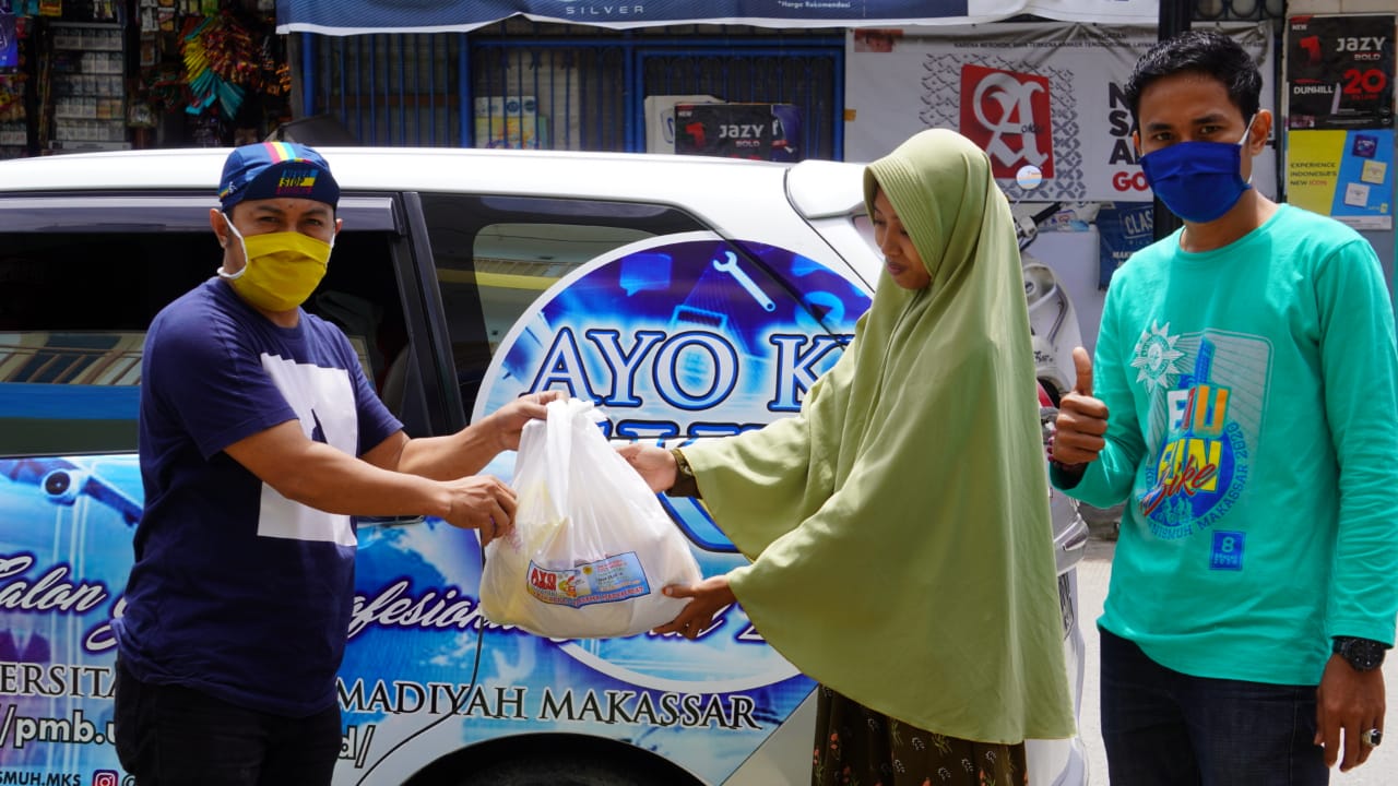 Relawan FKIP Unismuh Makassar Bagikan Sembako, Masker, dan APD pada Warga
