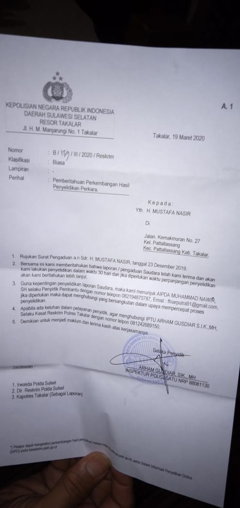 SULSELBERITA.COM. Takalar – Kasus Dugaan Kredit Fiktif BRI Cabang Takalar senilai 2 Miliar lebih Yang sudah lama Bergulir di Polres Takalar, dimana yang  menjadi Korban adalah sala satu pengusaha Bahan Bangunan Di Takalar H. Mustafa Nasir yakni Pemilik Toko Armus, kini pihak penyidik Polres Takalar memanggil dan memeriksa pihak BRI Cabang Takalar sebagai twrlapor.  Senin, (13/4/2020).