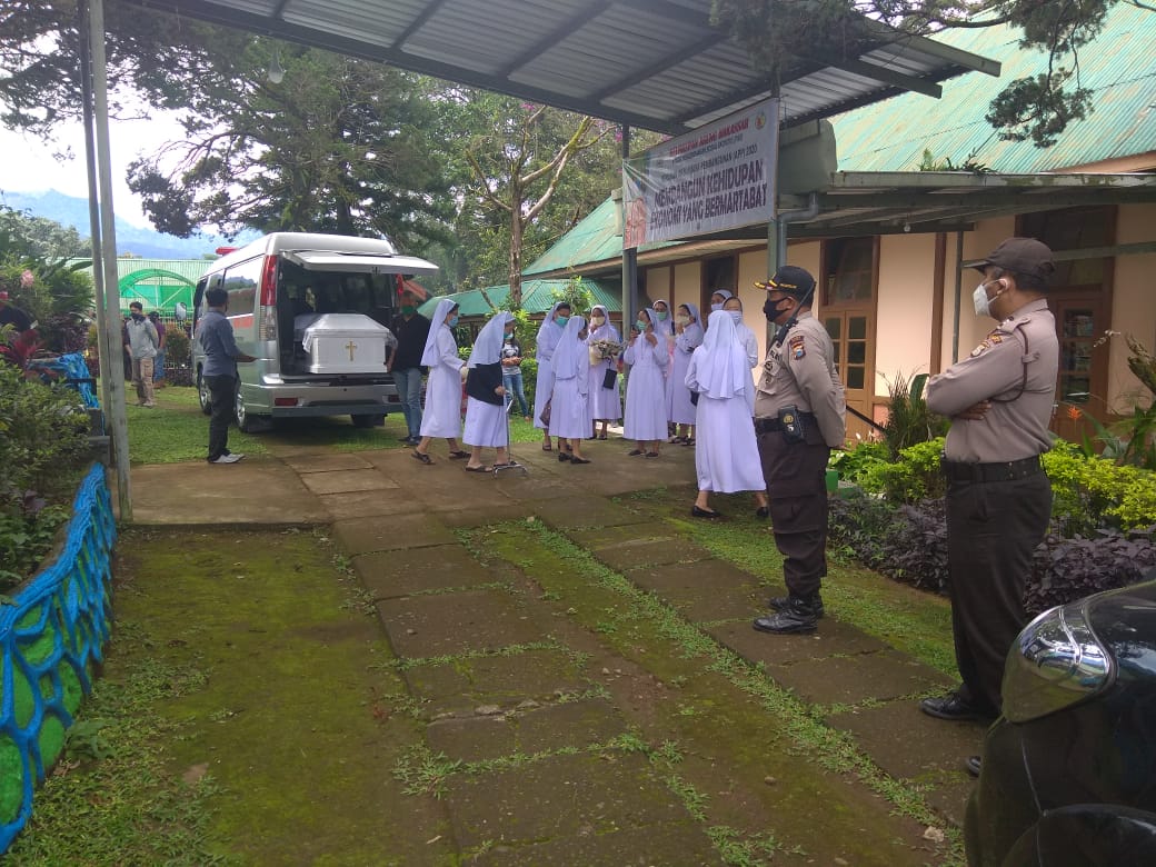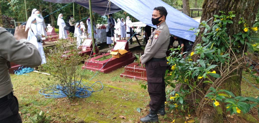 Kehadiran personil Polsek Tinggimoncong di pemakaman salah satu suster yang meninggal dunia untuk mengantisipasi masyarakat sekitar perkuburan agar tidak terprofokator dengan virus covid19.