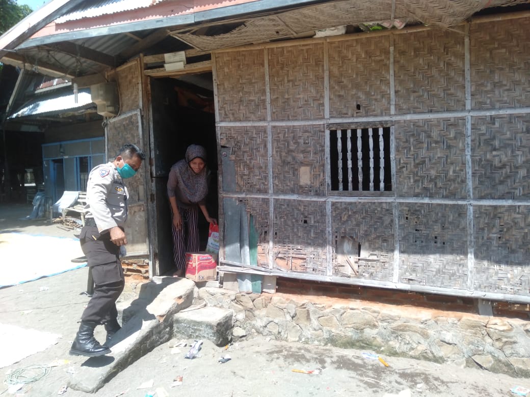 Bhabinkamtibmas Desa Ujung baji Polsek Mappakasunggu Aipda Abd. Jalil mengunjungi warga bagikan sembako kepada masyarakat yang Kurang mampu di Dusun Makkio baji Desa Ujung baji Kecamatan Sanrobone Kabupaten Takalar.