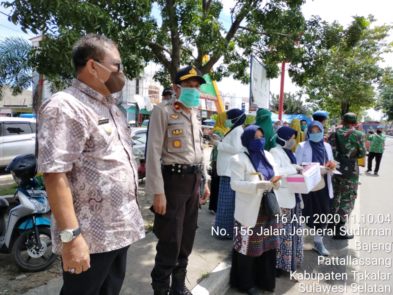 SULSELBERITA.COM. TAKALAR – Tiga pilar Kamtibmas Kecamatan Pattallassang yang terdiri dari unsur Kepolisian, TNI dan Pemerintahan Kecamatan Pattallassang Kabupaten Takalar Kabupaten Takalar, bersinergi mencegah penyebaran virus Corona. Hal yang dilakukan yaitu bekerja sama dengan Pihak Dinas Kesehatan Kabupaten Takalar dalam membagikan Masker dan Hand Sanitezir, Kamis 16/04/20 pagi.