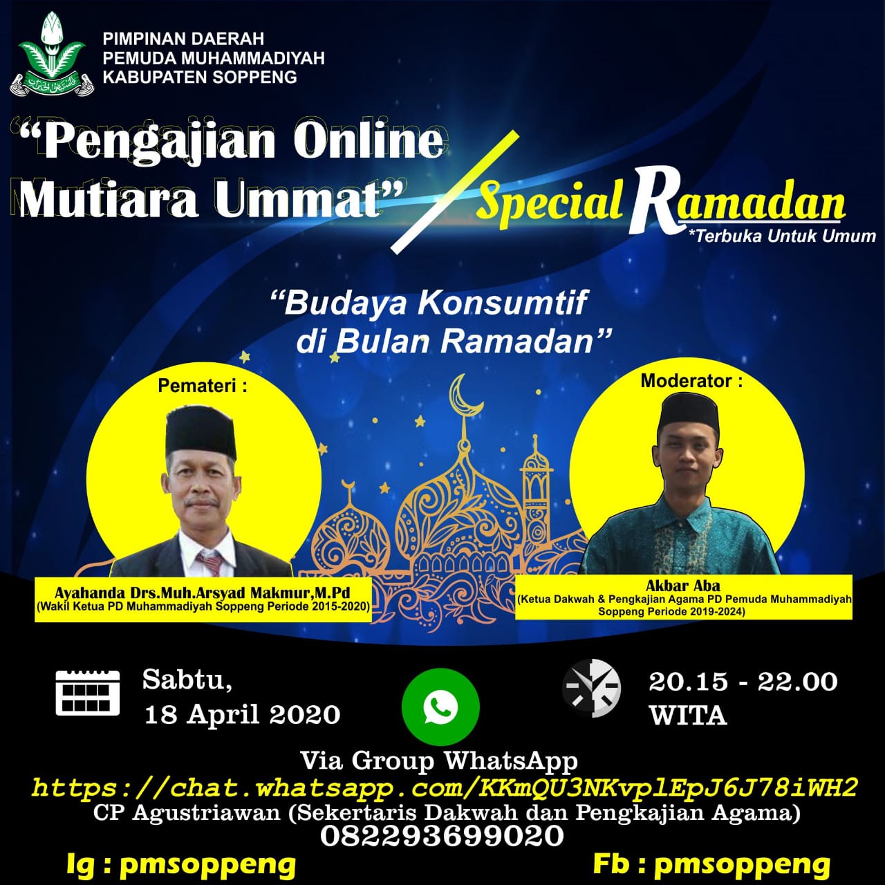 Pengajian online ini mengangkat tema ‘’Budaya Konsumtif di Bulan Ramadan’’. Jumlah yang mengikuti kajian online 143 peserta melalui via Group WhatsApp. Peserta yang mengikuti pengajian online tidak hanya dari  Pemuda Muhammadiyah  Kabupaten Soppeng, tetapi juga dari Makassar, Bone, Gowa, Bulukumba, Luwu, Sinjai, Barru, Jeneponto, Bantaeng bahkan berbagai pulau yang ada di Sulawesi menjadi  peserta.