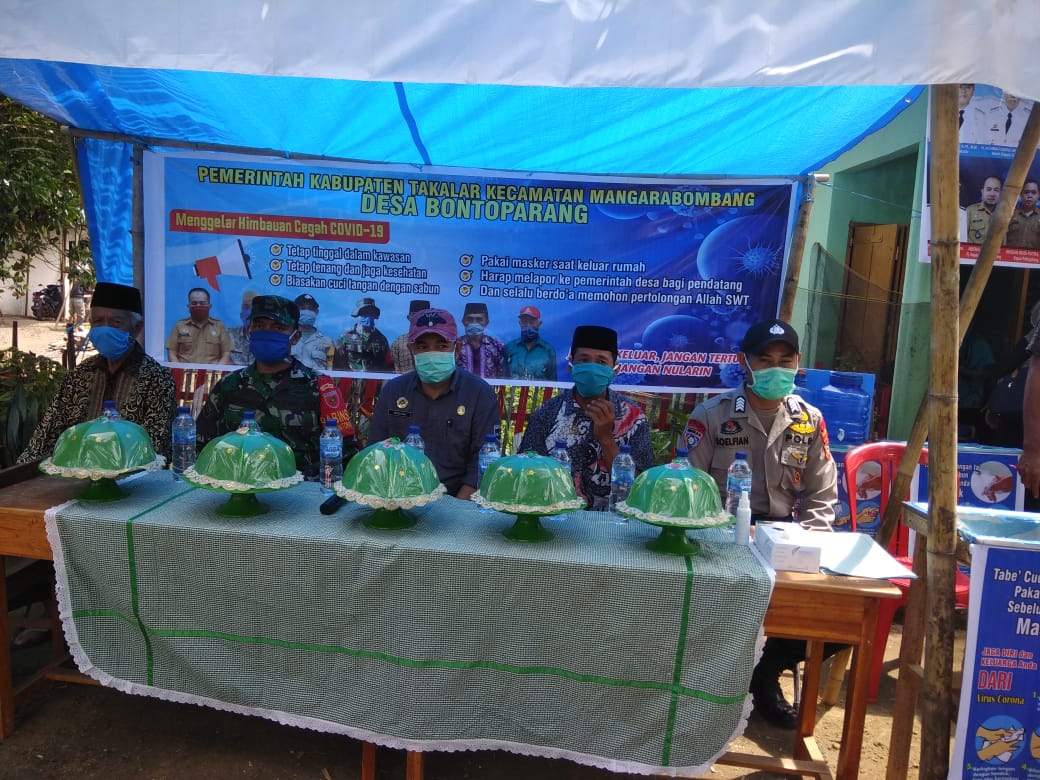 SULSELBERITA.COM. Takalar – Anggota Bhabinkamtibmas Polsek Mangarabombang Polres Takalar untuk Desa Bontoparang, Bripka Soelfian, Menghadiri Kegiatan Pengukuhan dan Peresmian Posko Relawan gugus terpadu covid-19 tingkat desa sebagai wujud pencegahan penularan covid-19 agar masyarakat dapat merasa aman tinggal dirumah dan apabila ada masyarakat yang butuh bantuan kesehatan dan informasi beserta himbauan pemerintah dapat cepat diminamalisir bersama-sama dan mengajak kepada masyarakat agar selalu memakai masker pada saat betaktifitas dan menjaga jarak apabila keluar rumah dan beraktifitas apapun untuk memutus rantai penyebaran dan Penularan Virus Corona ( Covid-19).Sabtu (18/04) Siang.