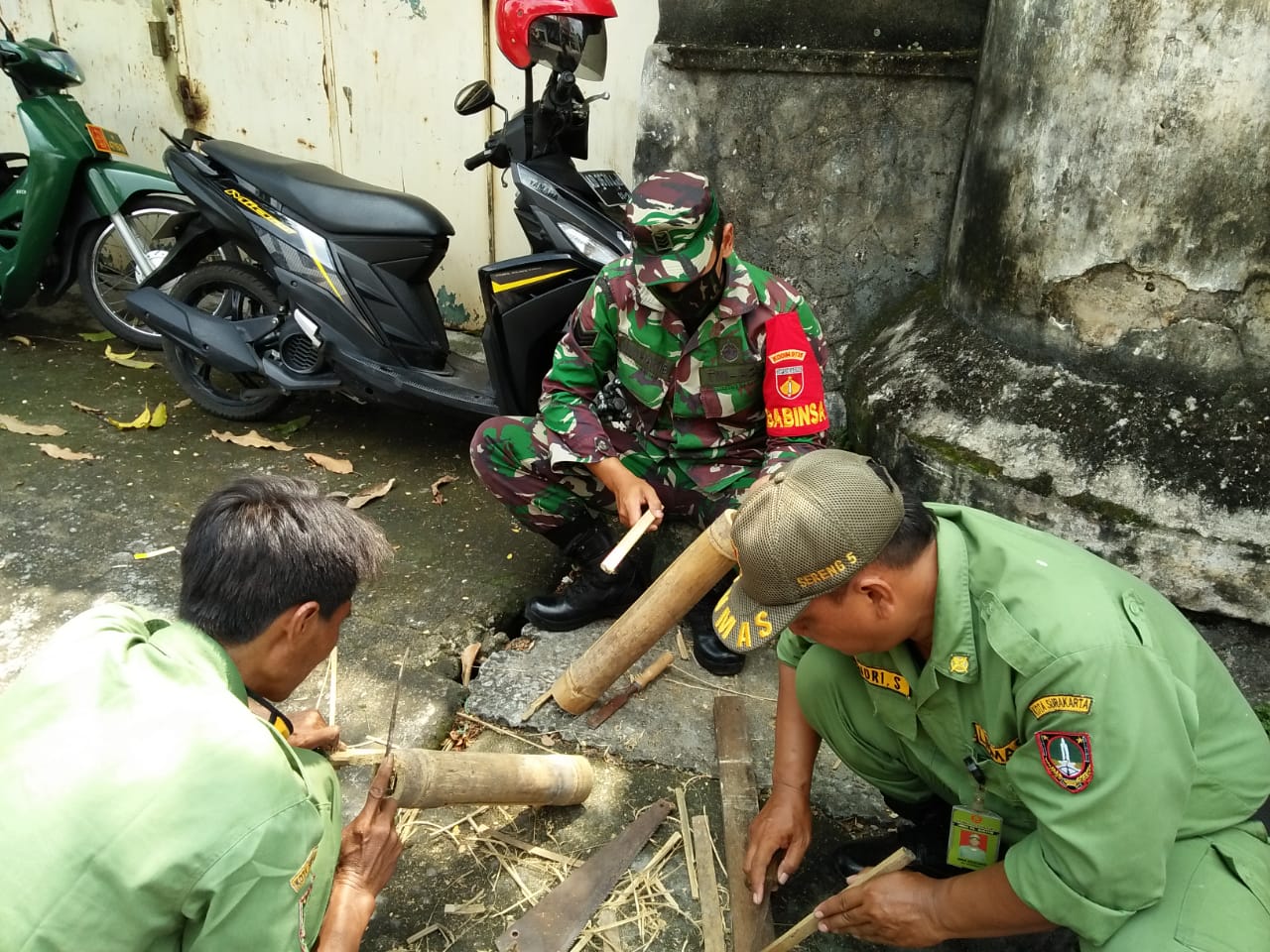 SULSELBERITA.COM. Surakarta – Menindaklanjuti Surat Edaran Walikota Surakarta, No:400/109 Tentang menggerakan siskamplin dan pendataan penduduk maka Babinsa Kel. Kemlayan Koramil 03/Serengan Kodim 0735/Surakarta Serka M.Nur Hakib dan Bhabinkamtibmas Aiptu Sarjono, mengajak linmas untuk membuat Kentongan, di depan Kantor Kelurahan Kemlayan (20/4/2020).