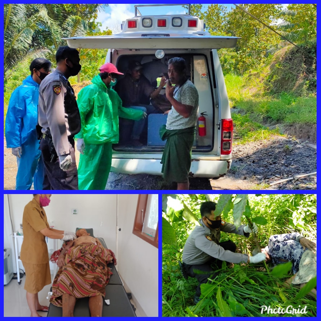 SULSELBERITA.COM. Tana Toraja, — Personil Polsek Bonggakaradeng Polres Tana Toraja yang terdiri dari Bripka Busram dan Bhabinkamtibmas Brigpol Fabricho Sulu, bersama dengan tenaga medis Puskesmas Buakayu mendatangi TKP penemuan seorang Warga yang tergeletak sakit di tengah kebun miliknya di Bena Lembang Buakayu Kec. Bonggakaradeng Kab. Tana Toraja. Senin (20/04/2020).