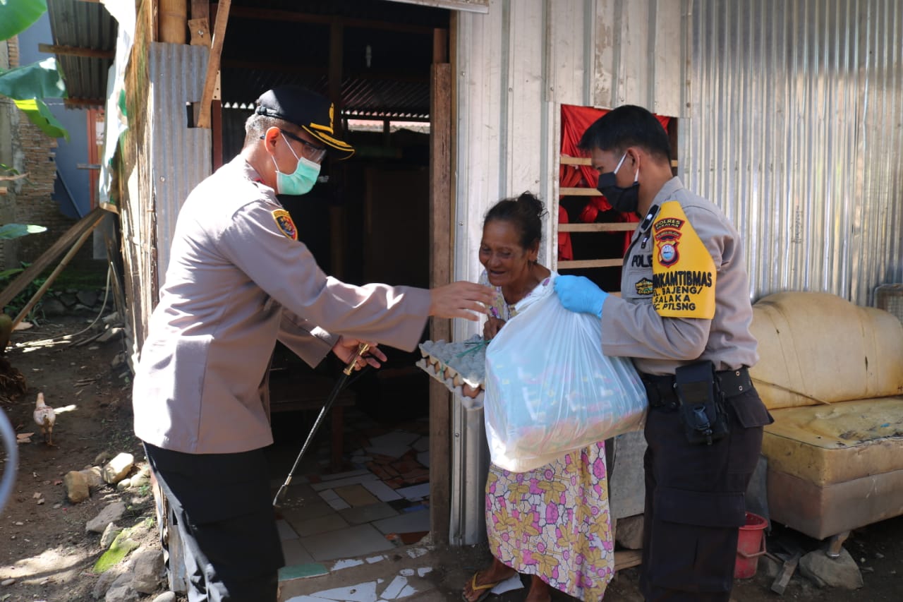 “Kita salurkan sembako bagi  keluarga kurang mampu merasakan dampak wabah covid -19 yang mana paket sembako terdiri dari 5 kg beras dan 30 butir telur ayam, minyak goreng 1 liter, mie instan 8 bungkus, gula 1 kg, terigu 1 kg, susu 1 kaleng dengan kegiatan ini kita harapkan bisa membawa manfaat untuk meringankan beban hidup warga terdampak covid 19,” jelas Kapolres.