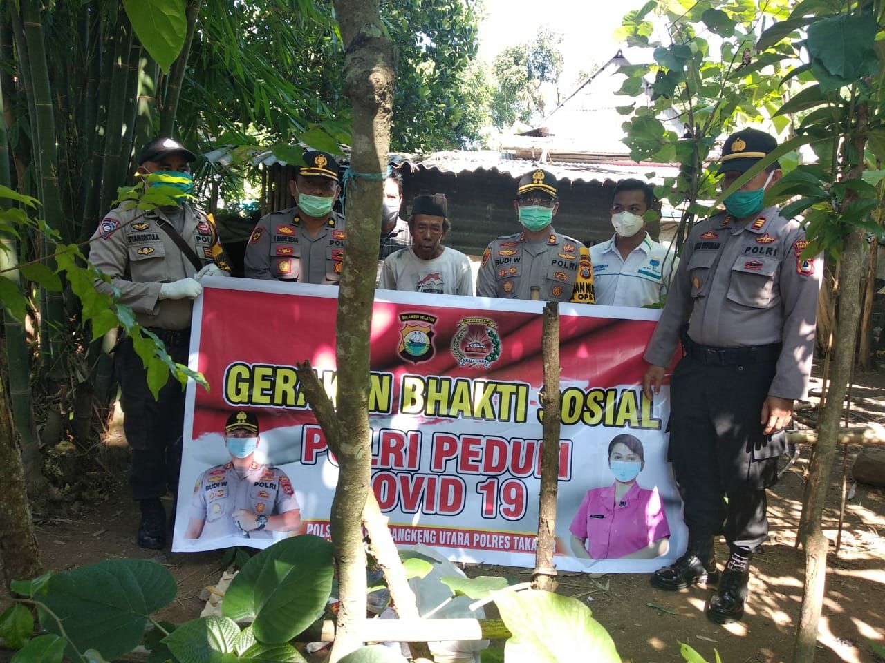 SULSELBERITA.COM. Takalar – Kapolres Takalar AKBP Budi Wahyono, SH.,SIK.,MH didampingi Kabag Sumda Kompol I Made Mega, Kapolsek Polongbangkeng Utara AKP H Andi Hermansyah SH dan Bhabikamtibmas Palleko Aipda Syamsuddin menyerahkan bingkisan paket sembako Gerakan Bakti Sosial Polri Peduli Covid-19, kepada Bara Dg Lau yang terdampak  Covid-19 di Wilayah Kecamatan Polongbangkeng Utara. Selasa (21/04/2020)