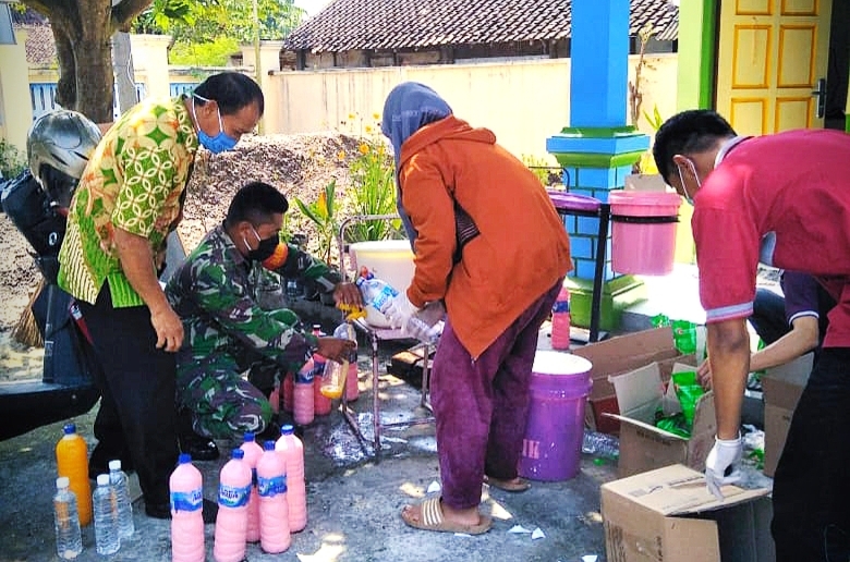 Babinsa Serda Edy Sarjono Bantu Perangkat Desa Ketitang dan Bidan Desa Ketitang Buat Cairan Disinfektan Mandiri
