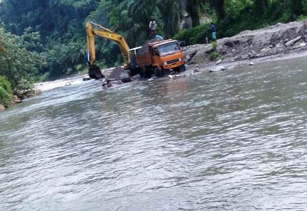 DAS yang dikuras pengusaha galian C tersebut kini mencapai ratusan meter. Order material sungai itu diangkut truk bertonase raksasa ke berbagai daerah. “ Puluhan truk setiap hari material sungai dikeruk dan tidak ada pengawasan dari penguasa terkait,” ujar warga setempat.