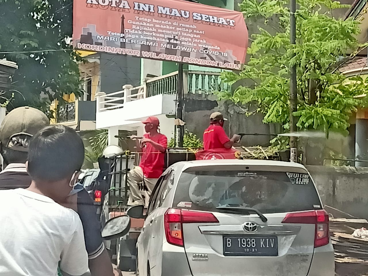 Acara yang berlangsung Jumat pagi dan sore (23/04/2020) ini dilaksanakan di beberapa RT/RW di Kelurahan Cinere, Kecamatan Cinere, Kota Depok. Tampak petugas dan relawan kelilng kampung melakukan penyeprotan mengunakan mobil pick-up terbuka.