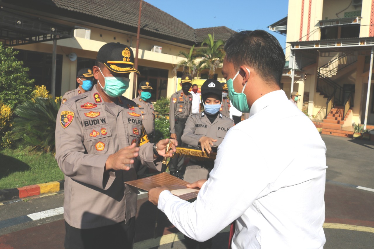 SULSELBERITA.COM. Takalar – Kapolres Takalar AKBP Budi Wahyono, S.H., S.I.K., M.H., memberikan penghargaan kepada Kasat Reskrim Iptu Arham Gusdiar, S.I.K., M.H., Brigadir Jufri, Briptu Hesti, Briptu Merli Dwi Cahyani di lapangan Apel Mapolres Takalar, Rabu (29/04/2020).