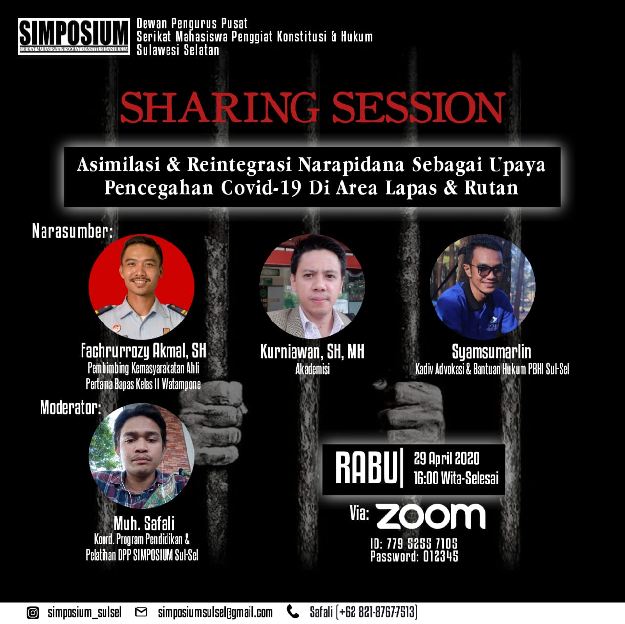 SULSELBERITA .COM. MAKASSAR – DPP Serikat Mahasiswa Penggiat Konstitusi dan Hukum Sulawesi Selatan gelar Sharing Session melalui Via Zoom Meeting bertemakan Asimilasi dan  Reintegrasi Narapidana Sebagai Upaya Pencegahan Penyebaran Covid-19 Di Are Alapas dan Rutan sore tadi pukul 16.00 Wita. Rabu (29/04/2020)