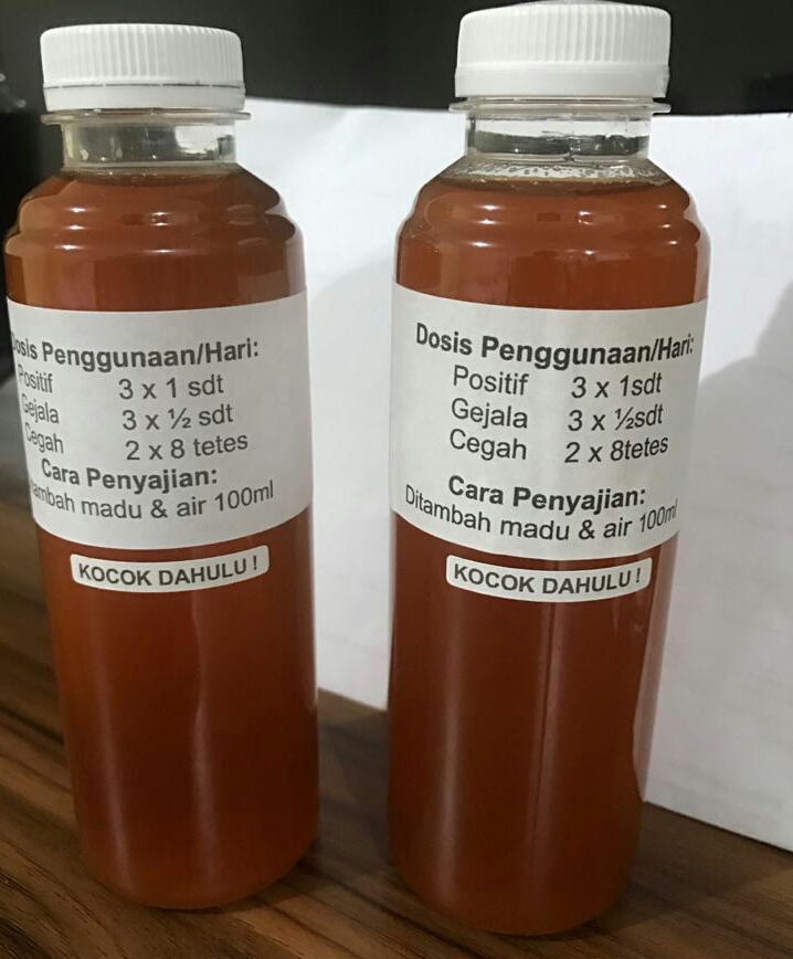 •Untuk pasien dengan kondisi gejala covid19, 1/5 sendok teh diminum 3 kali sehari; dan untuk kondisi pasien yang sudah positif covid19, 1 sendok teh diminum 3 kali sehari dengan mencampurkan masing-masing pengunaan di campur madu 1 sendok teh dan air mineral 100mili.
