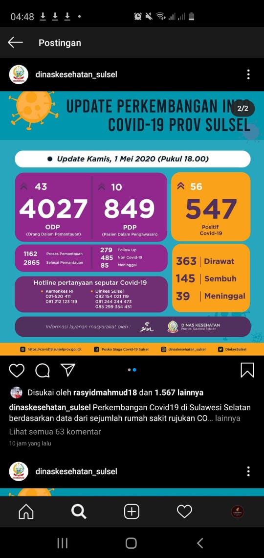 Nyatanya menurut statistik di sulsel yan di update pada hari kamis tanggal 1 mei 2020 pukul 18.00 Wita, sebanyak  547 warga sulsel yang sudah terjangkit dan 145 yang sudah sembuh, sementara yang meninggal sebanyak 39 orang. Belum lagi yang sudah terjangkit tapi tidak menunjukkan gejala