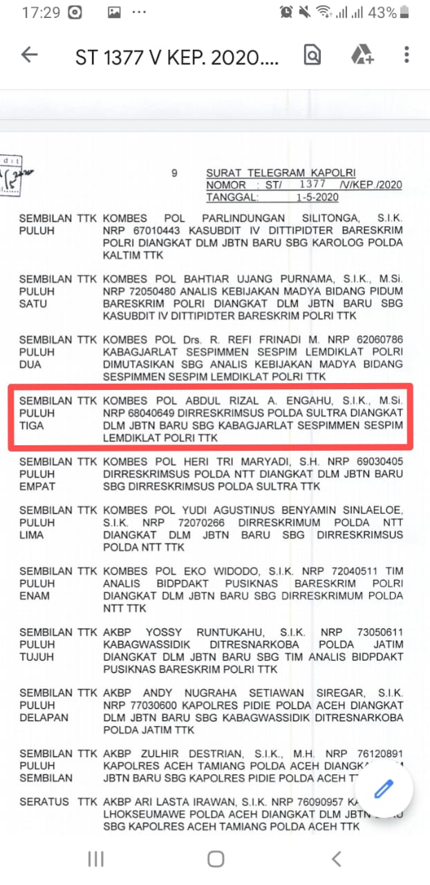 SULSELBERITA.COM. Kendari – Kombes Pol Abdul Rizal A. Engahu, S.I.K.,M.Si akhirnya dicopot dari jabatan Direktur Reskrimsus Polda Sultra, sebagaimana dalam surat telegram Kapolri Nomor : ST/1377/V/KEP./2020 Tanggal 1 Mei 2020 Tentang Pemberhentian dari dan Pengangkatan dalam jabatan dilingkungan Polri yang ditanda tangani langsung oleh Wakapolri Komjend Pol. Gatot Edi Pramono. M.Si.
