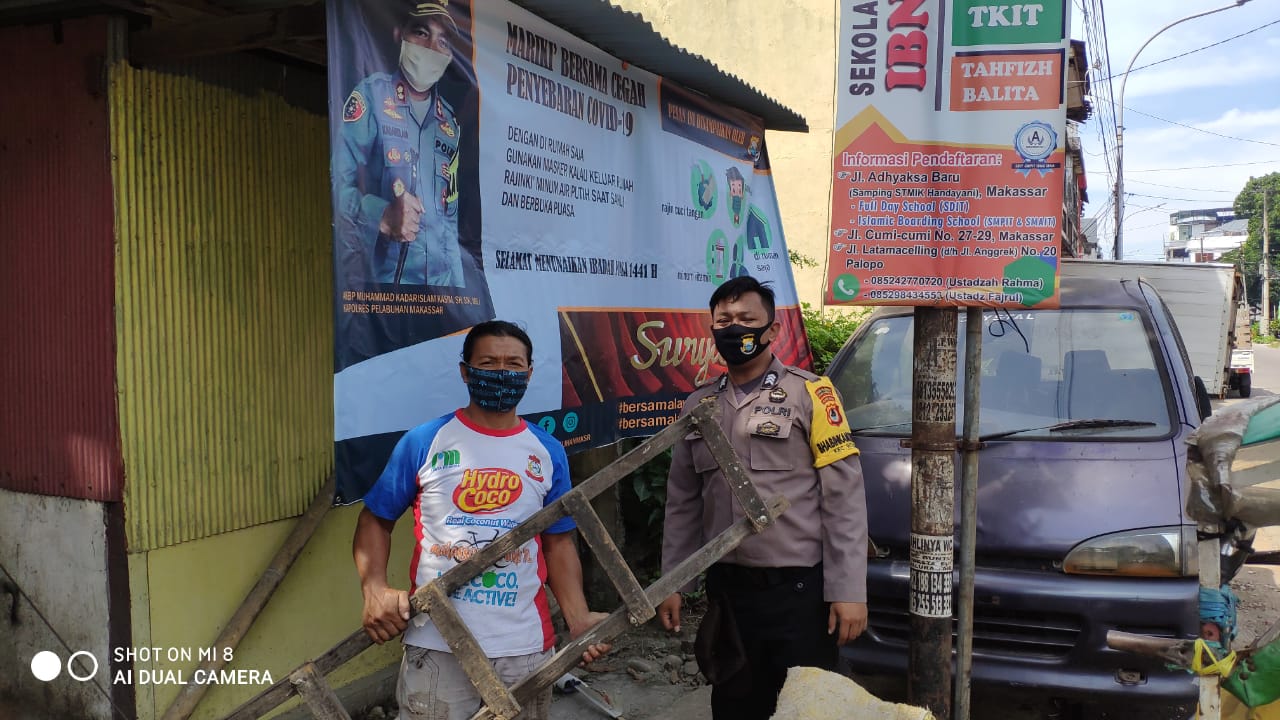 SULSELBERITA.COM. Makassar, – Salah satu Upaya Polres Pelabuhan Makassar dalam melakukan percepatan penanggulangan dan memutus rantai penyebaran Covid – 19, Bhabinkamtibmas Polsek Wajo Brigpol Adhi Hidayat, memasang Spanduk yang bertujuan untuk memberikan sosialisasi dan penyuluhan kepada masyarakat terkait pencegahan virus Corona (Covid-19), Jum’at (08/05/2020).