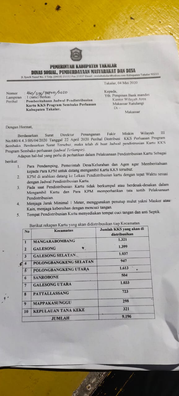 Penyaluran kartu ini merupakan kerjasama antara Dinas Sosial dan PMD dengan Bank Mandiri Cabang Takalar serta agen.