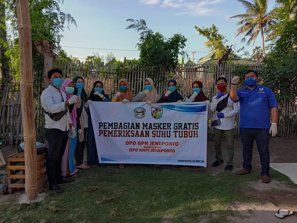 SULSELBERITA.COM. JENEPONTO – Pengurus DPD Gerakan Pemuda Nusantara (GPN) Kabupaten  Jeneponto turut ambil bagian dari penanganan Covid 19 yakni Bagi Masker dan Cek suhu badan warga, Minggu (10/05/20)