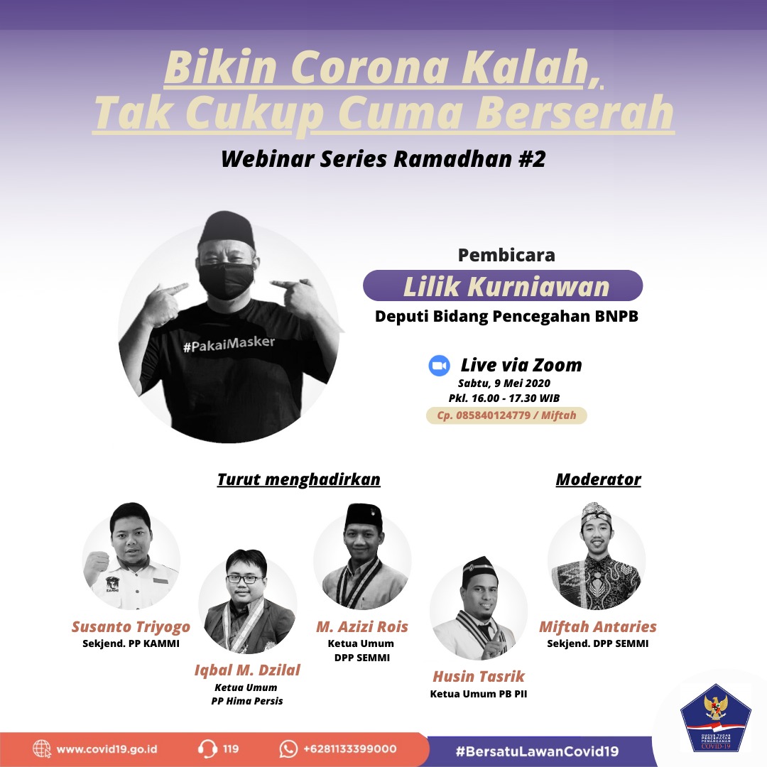 Diskusi online yang bertema “Bikin Corona Kalah, Ga Cukup Cuma Berserah” tersebut, menghadirkan Narasumber Lilik Kurniawan (Deputi Pencegahan Badan Nasional Penanggulangan Bencana), M.Azizi Rois (Ketua Umum DPP SEMMI), Iqbal M. Dzilal (Ketua Umum PP Hima Persis), Husin Tasrik (Ketua Umum PB PII) dan Susanto Triyogo (Sekjend PP KAMMI).