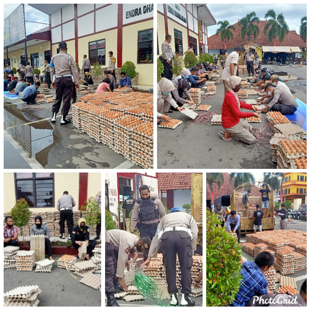 Melalui kebersamaan dan kekompakan para personil baik Polki, Polwan hingga ASN terus bekerja menyusun rak telur yang baru diturunkan dari kendaraan untuk dipacking bersama logistik lainnya