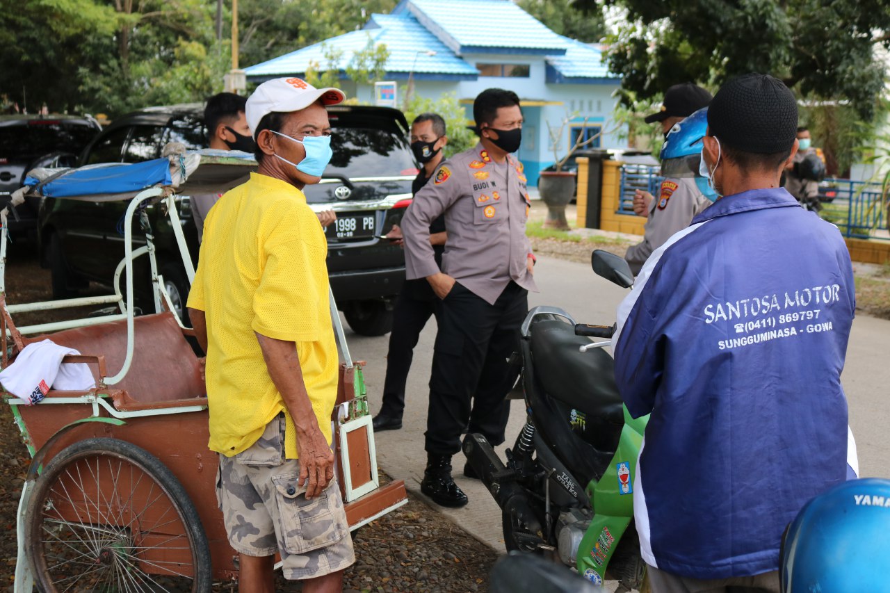 Saat Kapolres Takalar bersama rombongan melintas di persimpangan jalan depan Kantor Camat Polut, tiba-tiba kendaraan dinas Kapolres berhenti, kemudian Kapolres menghampiri tukang becak yang sedang mangkal untuk memberikan masker dan santunan.