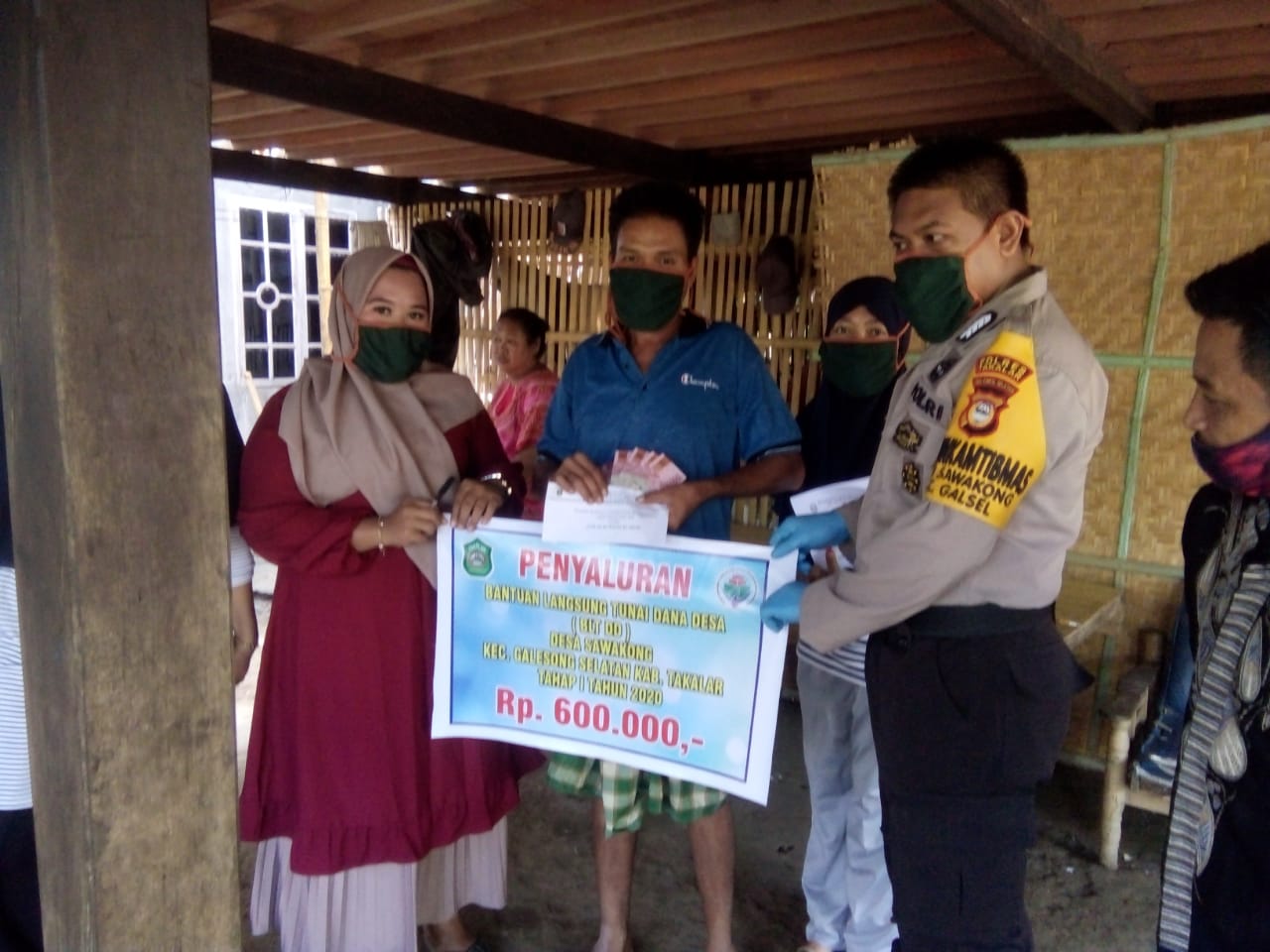 SULSELBERITA.COM.Takalar – Bhabinkamtibmas Desa Sawakong Polsek Galesong Selatan Polres Takalar Bripka Misbahu bersama Babinsa Desa Sawakong Serka Syamsuddin turut mendampingi Pemerintah Desa Sawakong Kecamatan Galesong Selatan Kabupaten Takalar menyalurkan bantuan BLT dari Dana Desa Sawakong, Jumat (29/05/20)
