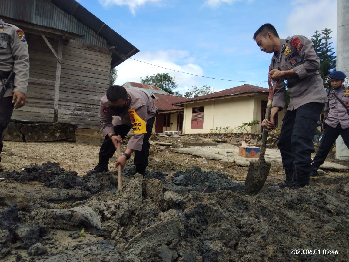 Personel Sat Brimobda Polda Sultra yang diterjunkan terlihat bergotong royong bersama masyarakat setempat dengan menggunakan peralatan apa adanya berupa cangkul dan sekop, untuk membersihkan saluran air atau drainase yang berada di bahu jalan yang sudah tertutup pasir dan sampah sehingga mengakibatkan saluran air tersumbat dan menjadi tergenang ketika hujan tiba.