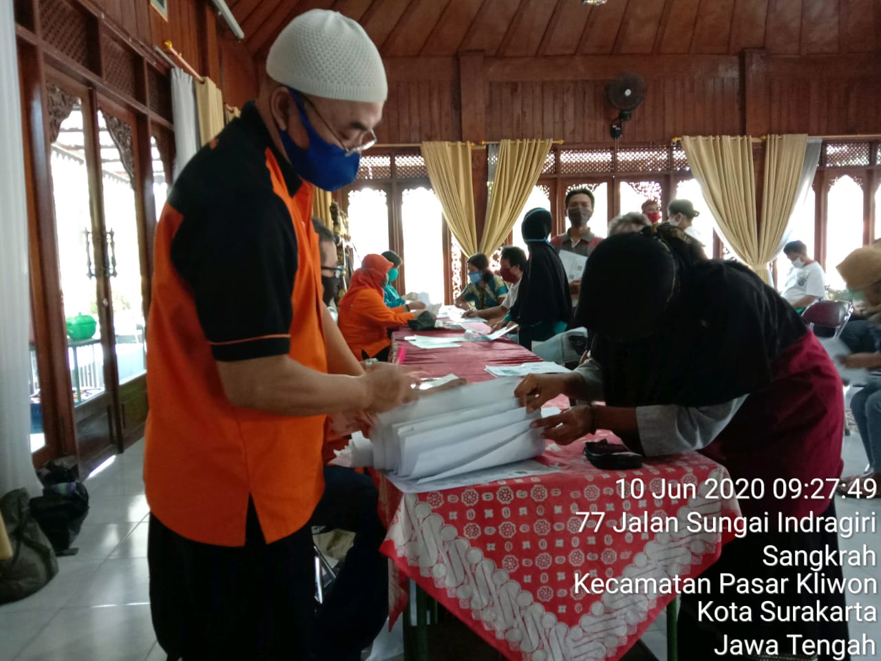 SULSELBERITA.COM. Surakarta – Rabu (10/06/2020) Sejak pagi pukul 07.00 WIB, masyarakat kelurahan Sangkrah sudah memadati Pendopo Kelurahan Sangkrah Kecamatan Pasar Kliwon, mereka mengantri untuk mendapatkan bantuan sosial (Bansos) Tunai yang mulai digelontorkan untuk membantu masyarakat yang terdampak Covid-19 oleh Kementerian Sosial (Kemensos) mulai hari ini masyarakat kelurahan Sangkrah yang akan mendapatkan BST ini sebanyak 1292 KK.