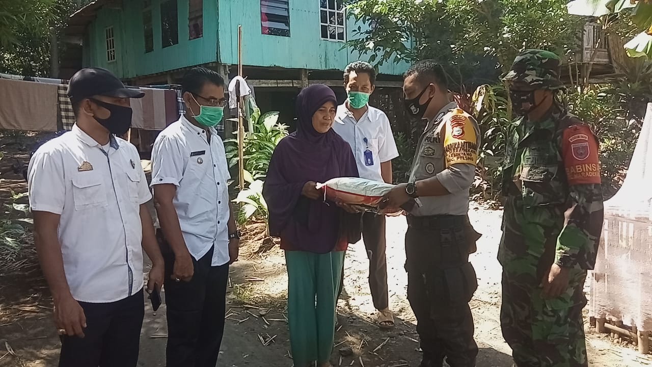 Seperti terlihat Bhabinkamtibmas Kelurahan Sabintang dan Maradekaya, Bripka Nafaah Asfan mendatangi rumah warga sambil membawa paket Sembako yang siap dibagikan.