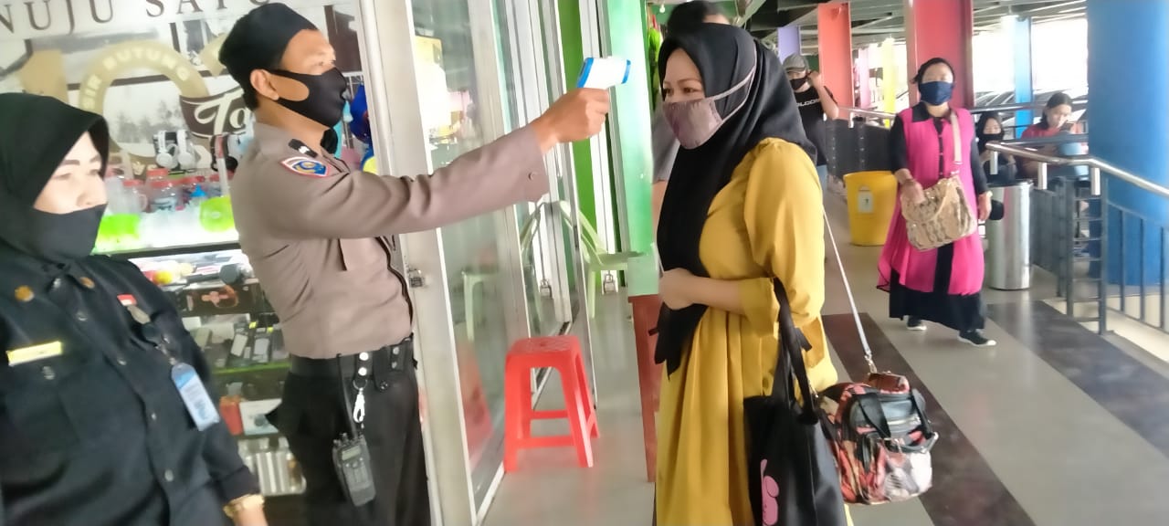SULSELBERITA.COM. Makassar, — Menuju Normal baru, Bhabinkamtibmas Kelurahan Butung Aipda Azis berikan edukasi protokol kesehatan sekaligus melakukan pengecekan suhu tubuh menggunakan Thermometer Gun kepada Pengunjung dan Pedagang Pasar Butung, Kamis (11/06/2020)