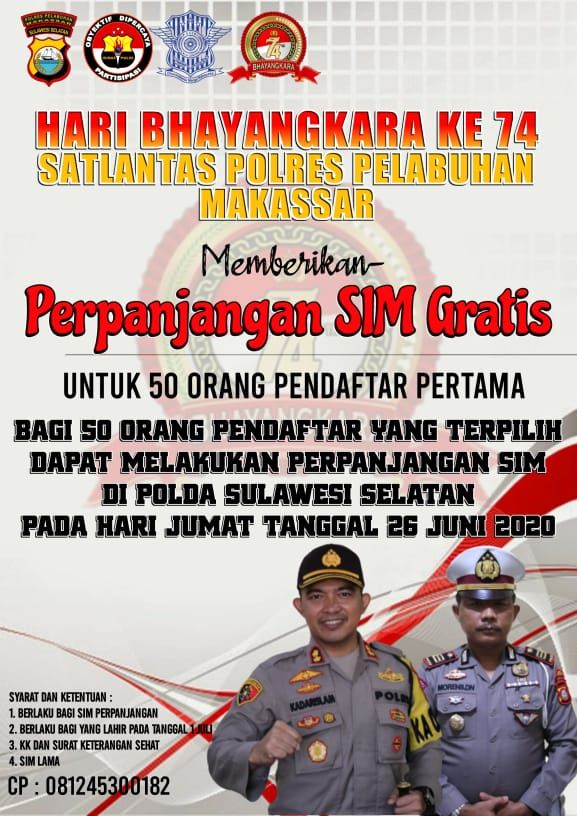 Bagi warga kelahiran 1 Juli yang bertepatan dengan hari Bhayangkara (Polri) , syarat untuk mendapatkan layanan perpanjangan ini bisa diperoleh di kantor Satlantas Polres Pelabuhan Makassar. Adapaun caranya, dengan menunjukkan Kartu Tanda Penduduk (KTP) Makassar dan Sim lama, guna untuk mendapatkan Info lebih lanjut bisa menghubungi Contact Person 081245300182