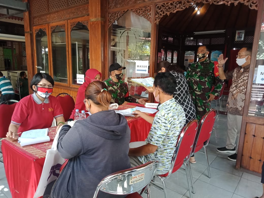 Babinsa Setabelan Serda Syukur dan Serda Narmin anggota Koramil 02/Banjarsari Kodim 0735/Surakarta bersama Aiptu Bambang Babinkamtibmas Setabelan melaksanakan pengamanan sekaligus monitoring penerima Bantuan Sosial Tunai (BST) tahap ke – 2 (dua) yang sedang berlangsung di Pendhopo kelurahan Setabelan, kecamatan Banjarsari, Kota Surakarta.