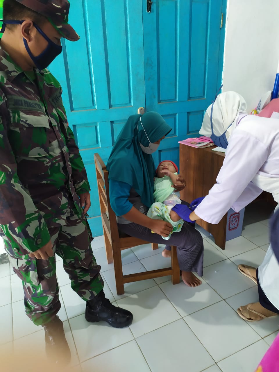 Untuk mencegah terjadinya penularan Covid-19, Babinsa Desa Kalinanas Serda Joko Presetyo membantu tim Puskesmas untuk mengontrol pelaksanaan protokol kesehatan selama kegiatan.