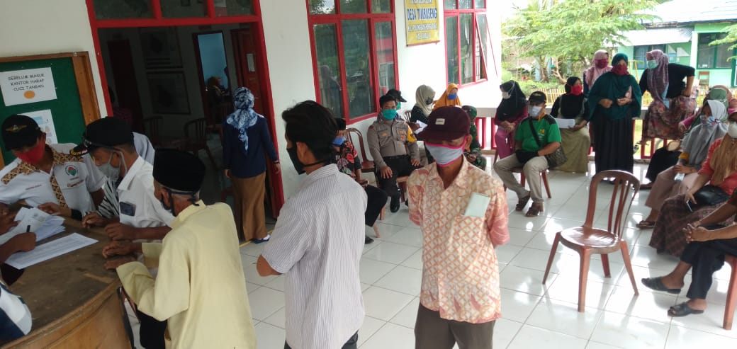 Bhabikamtibmas Polsek Polut PolresTakalar Desa Timbuseng, Bripka Nasrullah Nur Pratama memantau dan mendampingi warga penerima di desa binaannya saat  penyaluran.