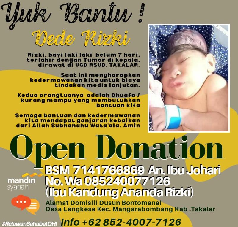 Terkait kondisi bayi penderita tumor di kepala tersebut, pihaknya mengajak para dermawan dan donatur agar dapat menyumbangkan bantuan kepada keluarga bayi penderita Tumor di Kepala itu untuk biaya pendampingan pengobatan anak tersebut ke rumah sakit.