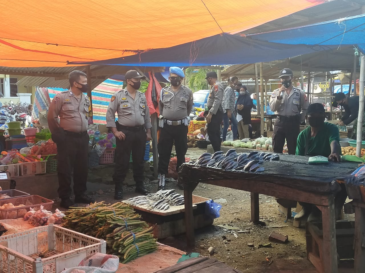 Kapolsek Galsel Polres Takalar Sampaikan Himbauan Penerapan Protokol Kesehatan Kepada Warga di Pasar