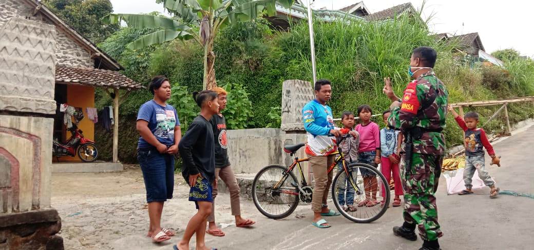 Babinsa Desa Suroteleng Koramil 07/Selo Kodim 0724/Boyolali Serda Sigit member pengertian kepada warga binaannya termasuk anak-anak yang sedang bermain di luar rumahnya, bahwa pandemi corona ini belum berakhir. Senin (06/07).