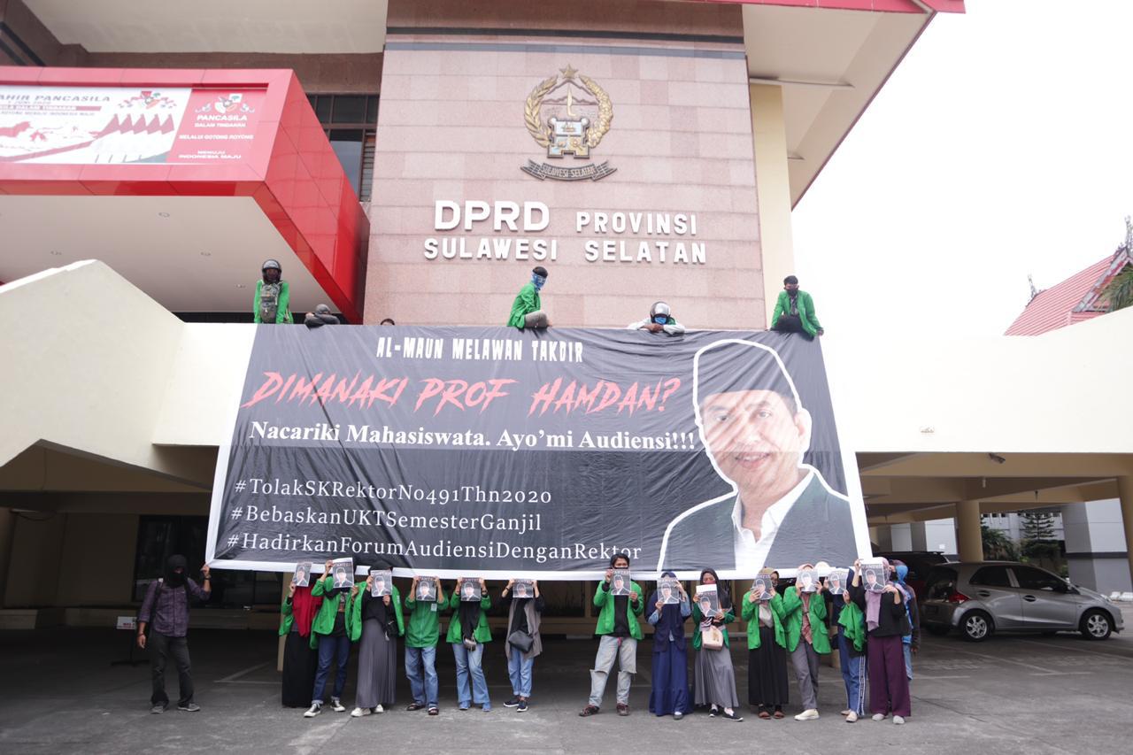 SULSELBERITA.COM. GOWA – Mahasiswa yang tergabung dalam Aliansi Mahasiswa UIN Alauddin Makassar (Al Maun) Melawan Takdir membentangkan spanduk berukuran besar diberbagai tempat bertuliskan “Dimanaki Prof Hamdan? Nacariki Mahasiswata. Ayo’mi Audiensi!!! #TolakSKRektorNo491Thn2020#BebaskanUKTSemesterGanjil#HadirkanForumAudiensiDenganRektor”, Minggu (05/07/2020).