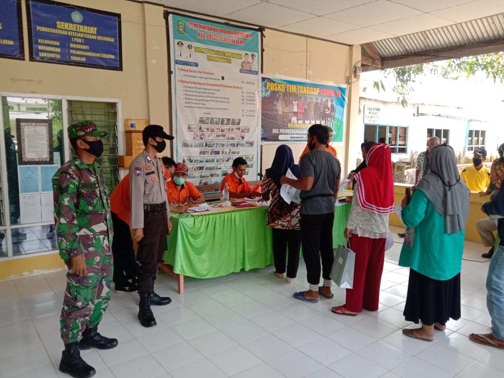 Bhabinkamtibmas Kelurahan Bulukunyi Polsek Polsel Polres Takalar Brigpol Ahmed Kamel bersama Babinsa Kelurahan Bulukunyi Serka Ariyanto, Babinsa Kelurahan Patte’ne Serka Ato Hamrianto dan Lurah Bulukunyi Muhammad Nur, SE., memantau giat penyaluran bantuan sosial tunai (BST) dari Kemensos Tahap III Tahun 2020 di kantor Kelurahan Bulukunyi Kecamatan Polombangkeng Selatan Kabupaten Takalar, Kamis (09/07/2020).