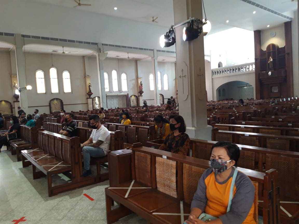 Adapun Ibadah Misa pada minggu pagi dibagi menjadi 3 yaitu jam 07.00, 08.00, dan jam 09.00 WIB dengan waktu misa di percepat masing masing 15 menit sudah selesai serta jumlah jemaat juga di batasi dan harus memiliki tiket pendaftaran pada hari sebelumnya.