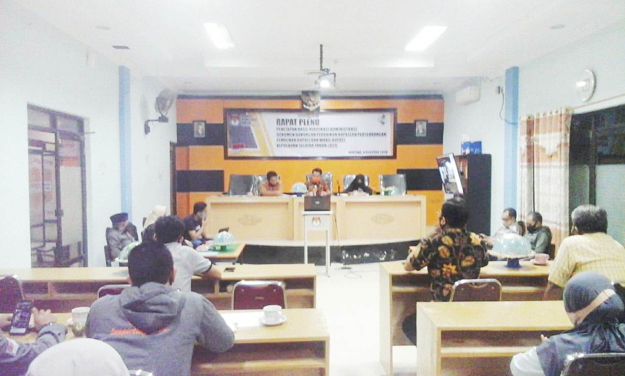 Pelaksanaan rapat pleno terbuka penetapan hasil verifikasi administrasi dokumen dukungan bakal calon perseorangan, ikut menghadirkan lo penghubung bakal pasangan calon perseorangan, Zaenal Abidin dan komisioner bawaslu yang diwakili Nurul Badriyah.