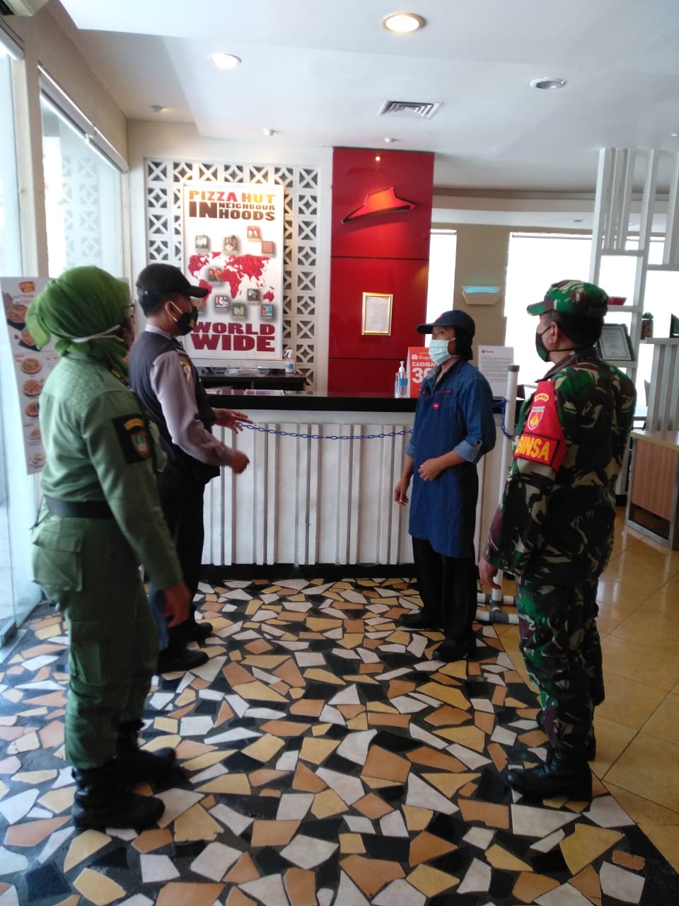 SULSELBERITA.COM. Surakarta – Senin (10/08/ 2020) pukul 09.00 Wib bertempat di Pizza Hut jl.Slamet Riyadi No.380 Kelurahan Purwosari Kecamatan Laweyan Kota Surakarta Babinsa Kelurahan Purwosari Koramil 01/Laweyan Kodim 0735 Surakarta Sertu Murdianto dan Serda Teguh Pria serta Babinkamtibmas Purwosari melaksanakan kegiatan komunikasi sosial dengan Mas Doyok salah satu karyawan pizza hut Slamet Riyadi.