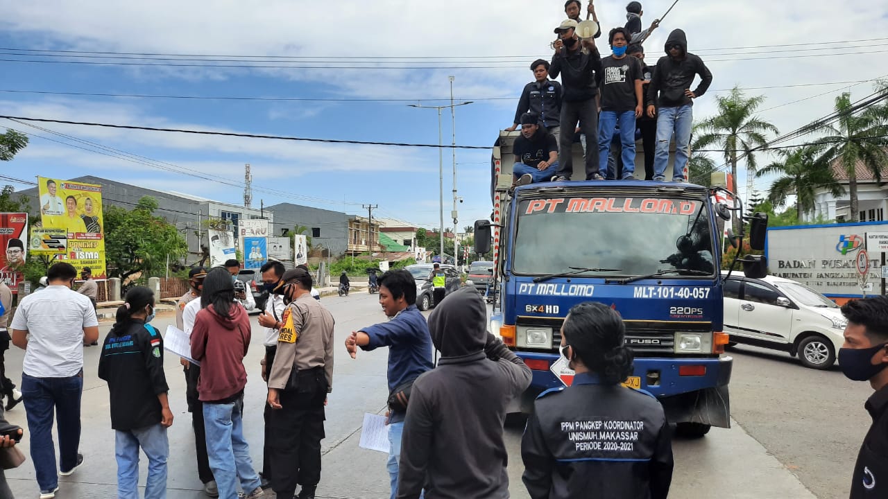 Peserta aksi melakukan orasi di perempatan jalan Poros Pangkep-Pare dan Jln. HM Arsyad kemudian dilanjutkan dialog di kantor DPRD Pangkep yang diterima langsung oleh ketua Pansus Penanganan Covid-19 DPRD Pangkep.