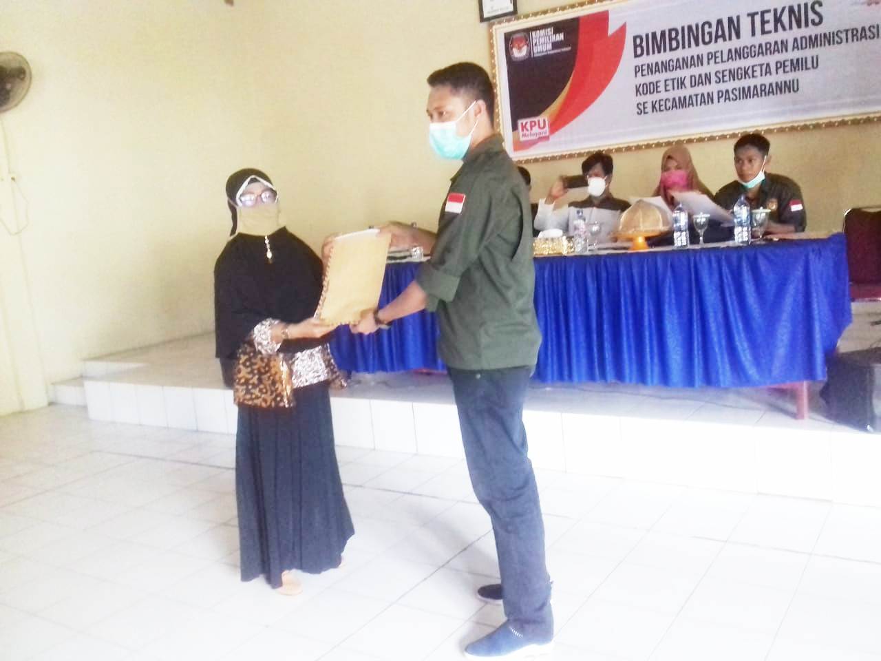 Bimbingan tekhnis penanganan pelanggaran administrasi, kode etik, dan sengketa pemilu yang dirangkaiakan dengan penyerahan dokumen dukungan perbaikan bakal pasangan calon (bapaslon) perseorangan dilaksanakan di ruang aula kantor camat masing-masing.