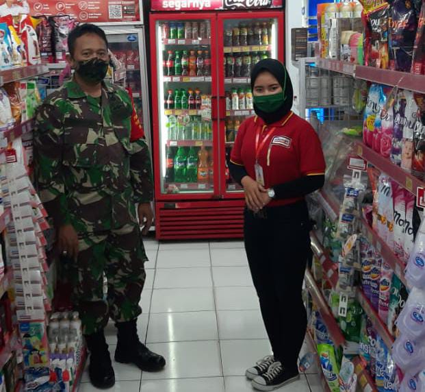 Dalam kesempatan tersebut Serda Agus R melaksanakan pengecekan dan menanyakan untuk Karyawan dan Pengunjung sudah mematuhi protokol kesehatan atau belum.