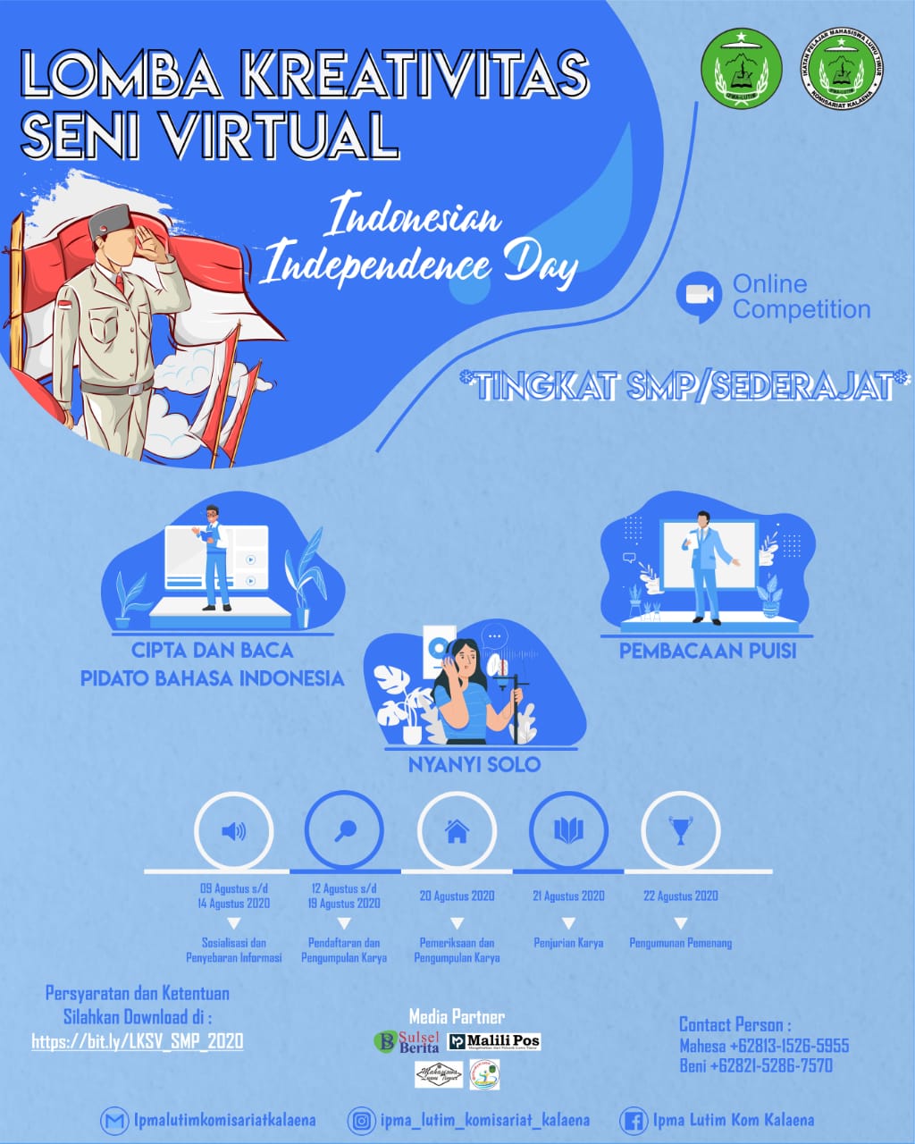 “Di tengah pandemi wabah Covid-19, HUT RI yang ke-75 harus tetap dirayakan karena ini menyangkut hari kemerdekaan negara kita. Walaupun dengan situasi berbeda, IPMALUTIM Komisariat Kalaena sebagai lembaga mahasiswa harus tetap kreatif dan tetap semangat untuk mengolah potensi minat dan bakat para kalangan masyarakat terkhusus di Kecamatan Kalaena. untuk itu, lomba seni virtual kali ini adalah cara alternatif yang bisa di manfaatkan”.